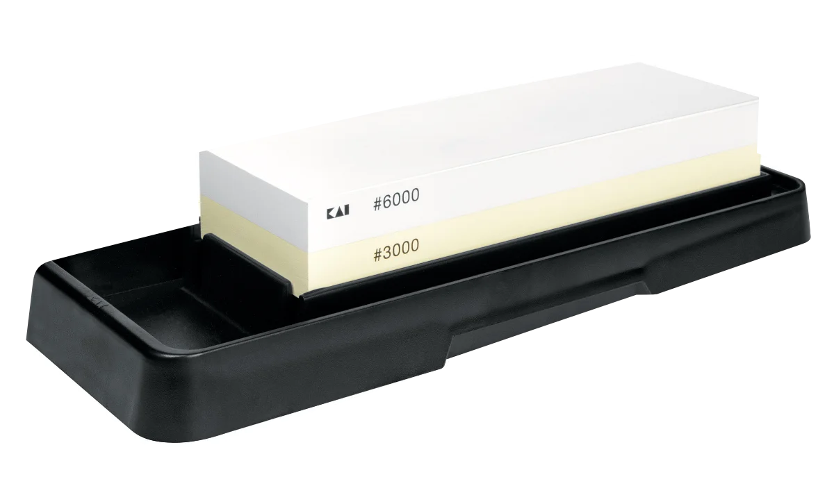 Kombinationsschleifstein AP-0316 von Kai mit praktischem Kunststoffhalter. Körnung 3000 und 6000.